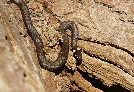 Auf einem umgestürzten Baumstamm sonnten sich zwei Ringelnattern.