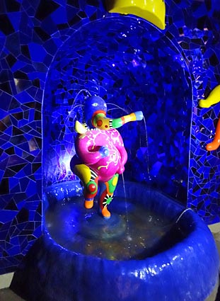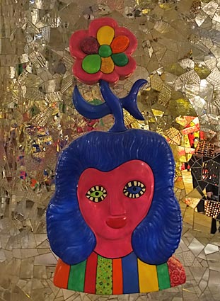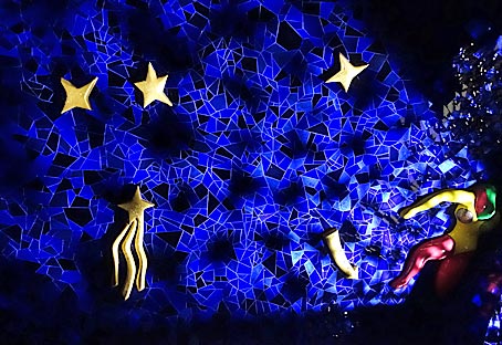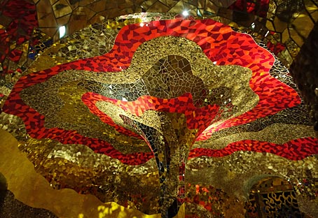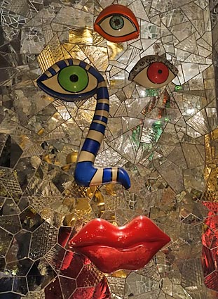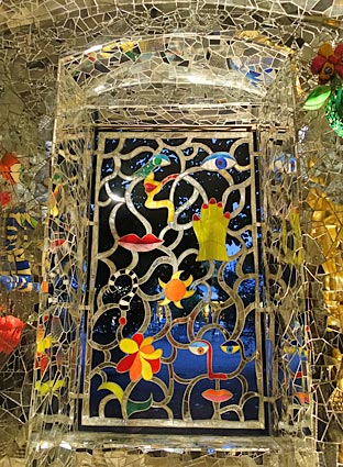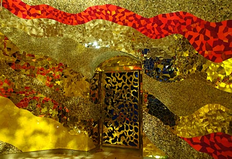 Die drei Räume sind mit Mosaiken aus buntem Glas und Spiegeln, sowie Kieseln und bemalten plastischen Figuren geschmückt