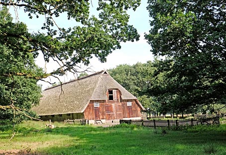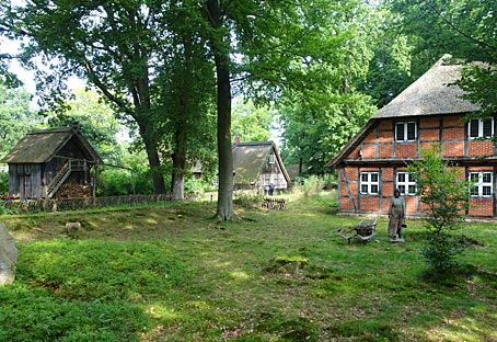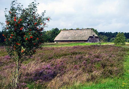 Das autofreie Heidedorf Wilsede mit seinen reetgedecken Bauernhäusern ist nur zu Fuß, per Rad oder mit der Pferdekutsche zu erreichen.