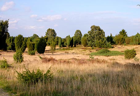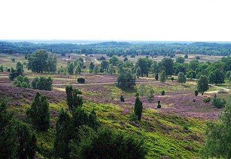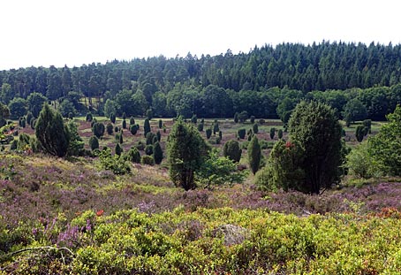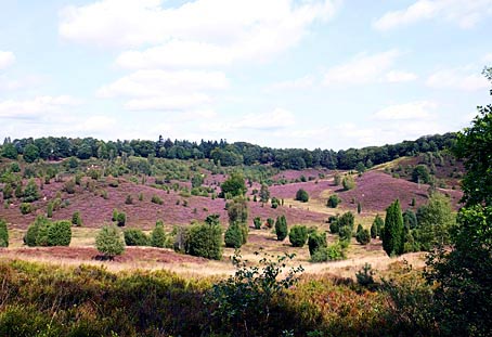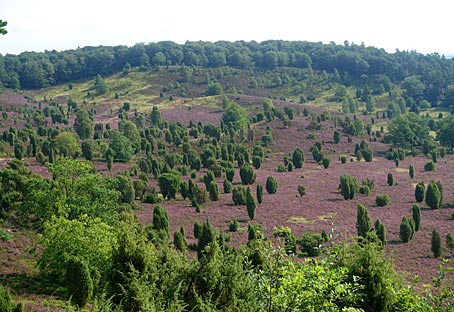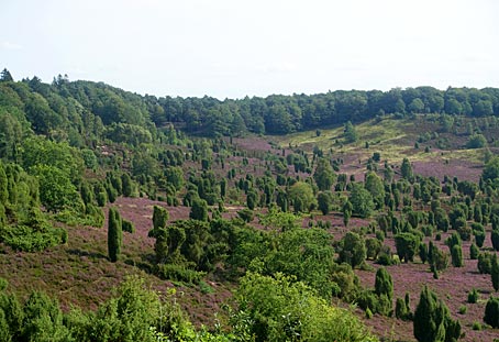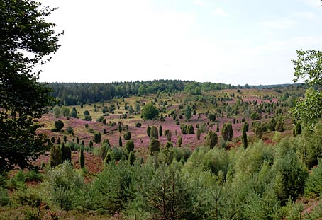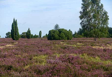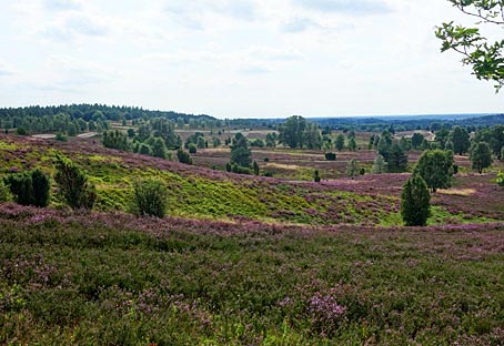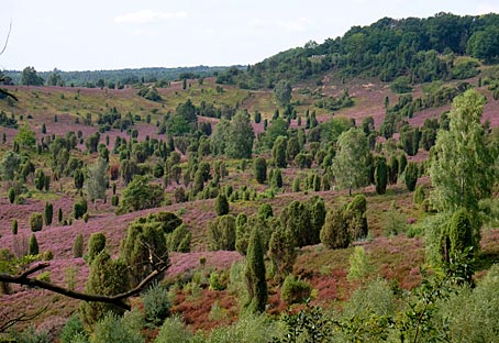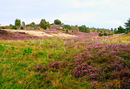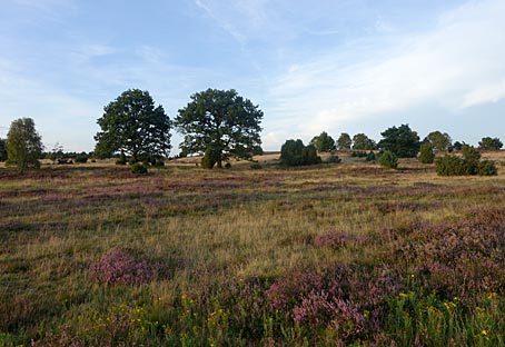 Die von Wacholderbüschen auffällig akzentuierten Heideflächen leuchten hier besonders schön.