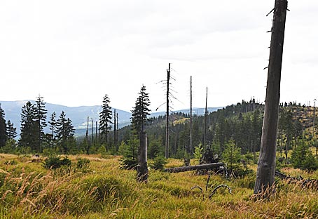 Der Wald am Lusen ist von noch stehenden, toten Baumstämmen durchsetzt. Ein Anblick, der sehr gewöhnungsbedürftig ist; es sah traurig aus.