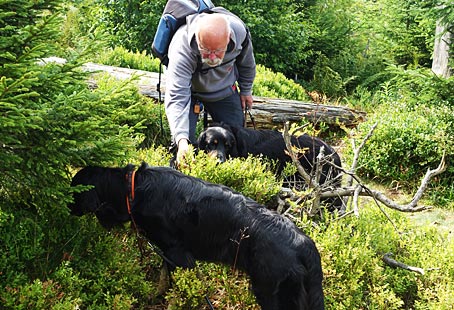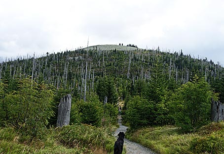 Ein erster Blick zum Gipfel des Lusen — Waldbeer-Ernte - auch die Hunde bedienten sich.