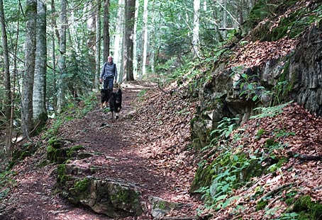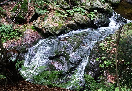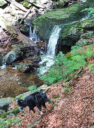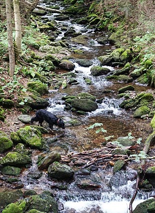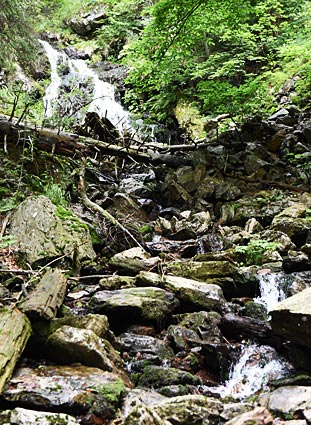 < An der nördlichen Grenze des Gebietes stürzt der Höllbach sich als Wasserfall in die Tiefe. Ich bin mit Carla nur bis zum Höllbachg'spreng mitgegangen |