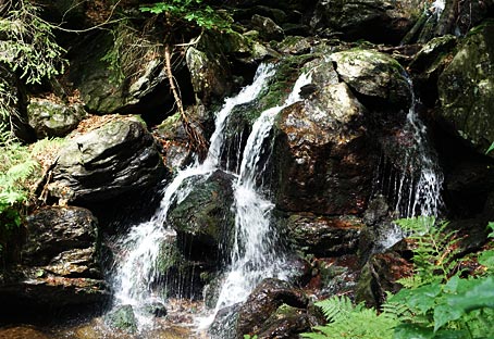 Engelsüß (Tüpfelfarn, Polypodium vulgare) — Durch eine enge, eingeschnittene Schlucht strömt der Höllbach zwischen teilweise haushohen Felsen aus Gneis.