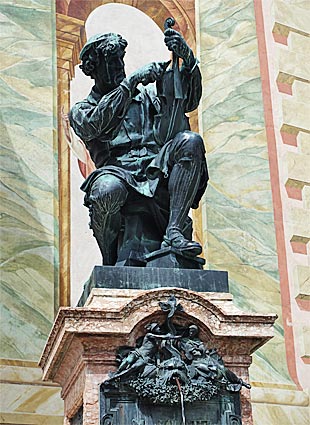 Denkmal des Begründers des Mittenwalder Geigenbaus vor der Kirche St. Peter und Paul