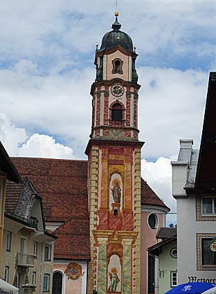 Der mit den Kirchenpatronen Petrus und Paulus bemalte Kirchturm ist das Wahrzeichen von Mittenwald.