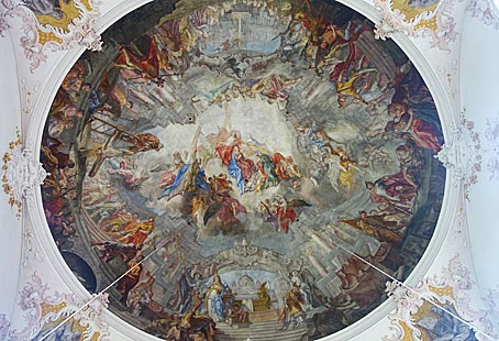 Umgeben wird sie von den auf Wolkenkissen schwebenden zwölf Aposteln,