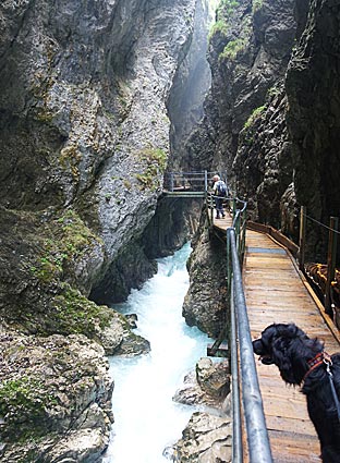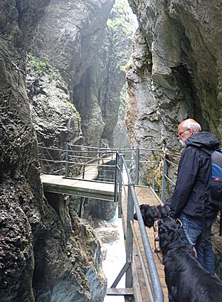 In die Alte Leutascher Klamm zum Wasserfall konnten wir die Hunde mitnehmen. Es ist der schönste Teil der Klamm.