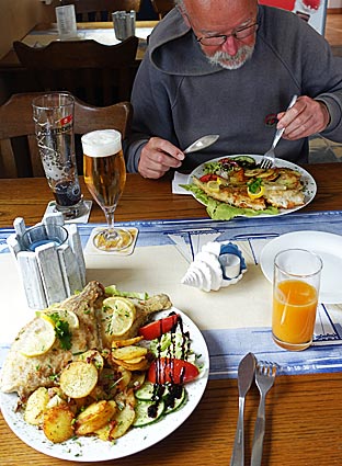 Im Restaurant "Zum Camper" bekommt man garantiert fangfrischen Fisch. Eigentlich wollte Helmut einen Sonnenuntergang fotografieren |