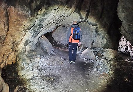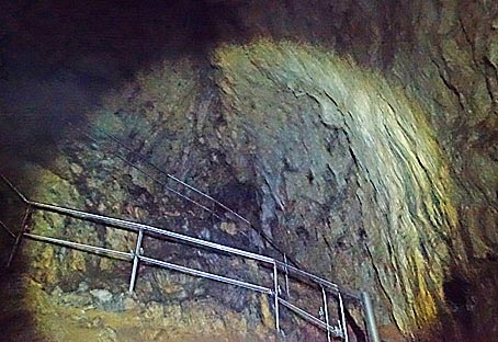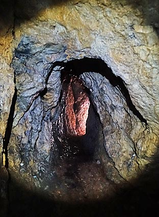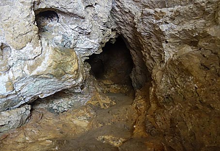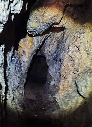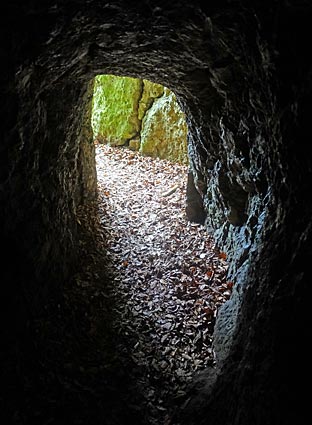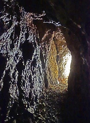 Durch den einer Spalte folgenden etwa 8 m langen und 1 m breiten künstlichen Ein-/Ausgang
