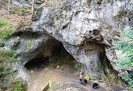 Die beeindruckende Rosenmüllershöhle am Fuße eines Dolomit-Felsmassivs