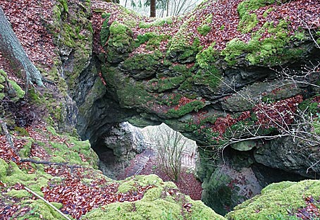 Etwas versteckt unter den Felsbrocken am Hohen Kreuz liegt die 35 m lange Doktorshöhle.