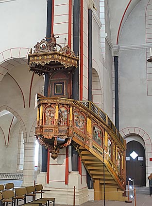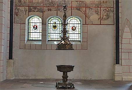 rechts: das von Putten getragene Taufbecken aus Messing (1573, Margnus Karsten)