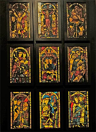 Mitte: spätromanisches Fenster von 1250 mit Szenen aus dem Leben und Martyrium der Heiligen Cosmos und Damian