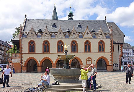 Der Marktplatz mit dem gotischen Rathaus und dem 900 Jahre alten Marktbrunnen.