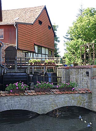 < Die 1604 erbaute Hagenmühle ist neben der Wassermühle Erkerode |