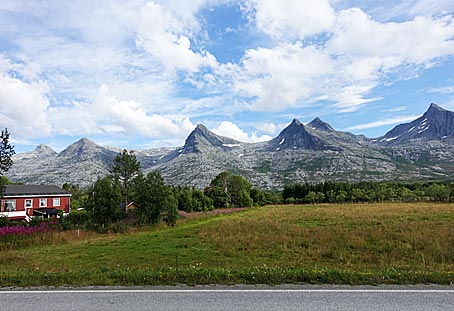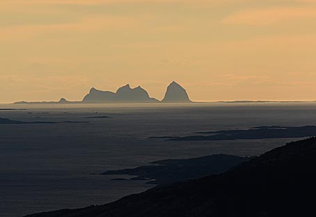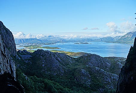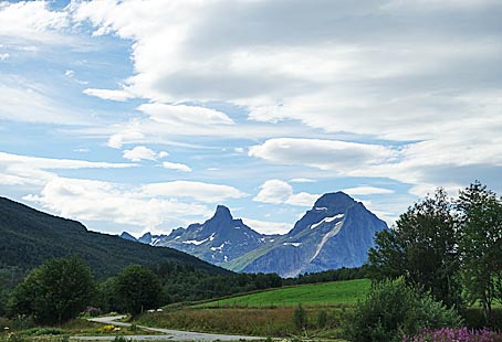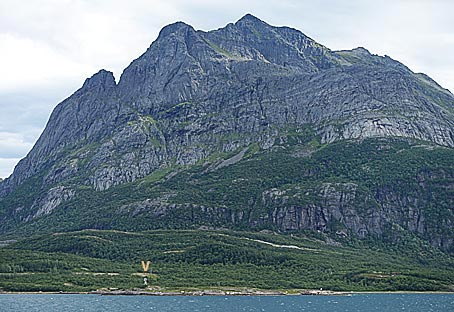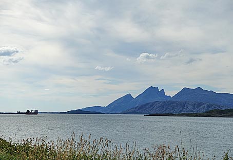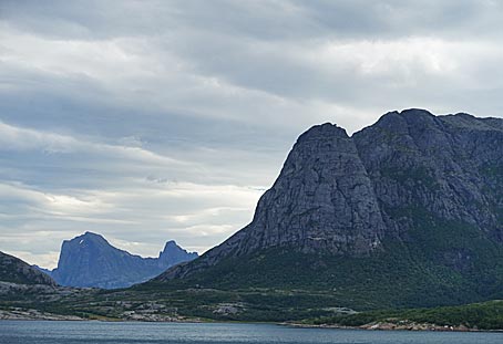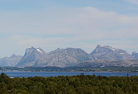 ^ 6 Gipfel der Bergkette "Sieben Schwestern" bei Sandnessjøen. In der Mitte die Doppelspitze der "Zwillinge"