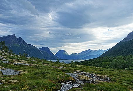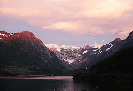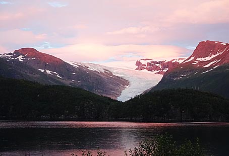 Gletscherglühen: Blick von unserem Übernachtungsplatz (66.7236, 13.6725) zum Gletscher