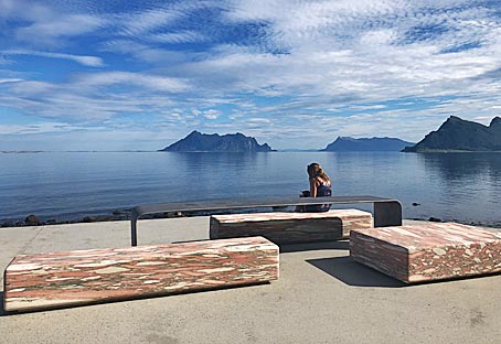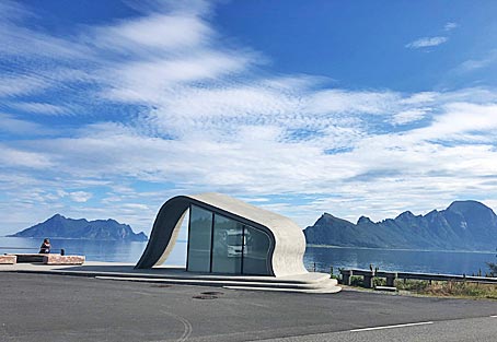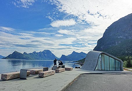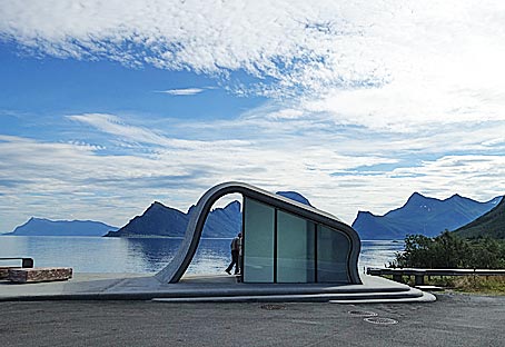 Rastplatz "Ureddplassen" (66.9504, 13.6317) mit einem Toilettenhäuschen in Form einer Welle