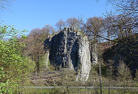 oben links: Blick aus der Höhle zur Burg Kusenstein — unten links: Die Kalksteinrippen der "Sieben Schwestern" (Sage)