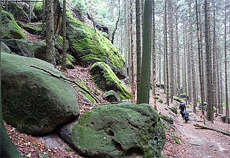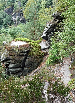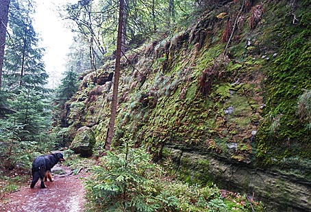 Auf der Zschandstraße vor der Neumannmühle rücken die mit dicken Moosschichten bewachsenen Felsen schlagartig zu einem klammartige Tal zueinander.