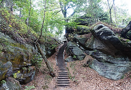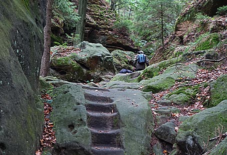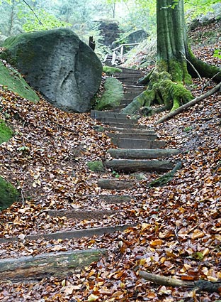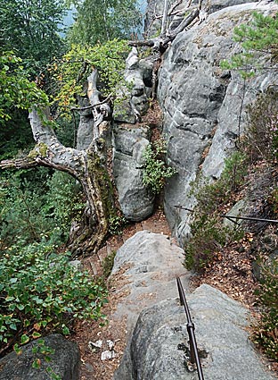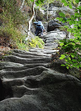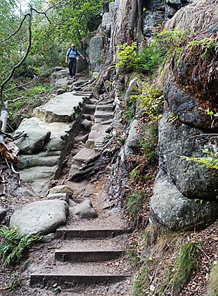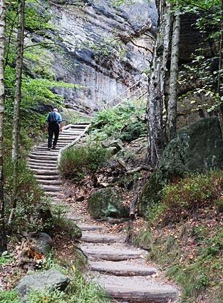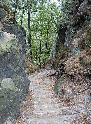 Im unteren Teil führt über er über viele Holzstufen im Zickzack in den Schmilkaer Kessel.