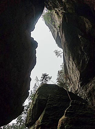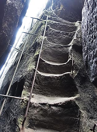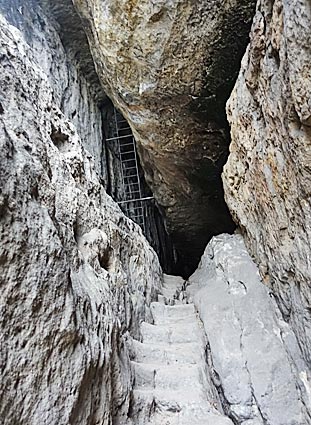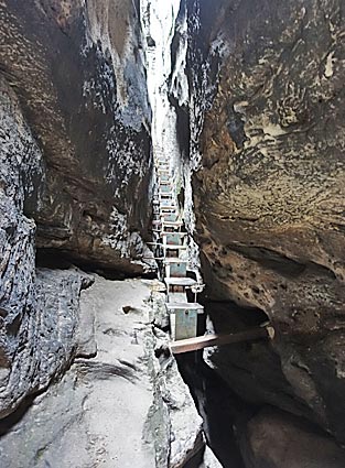 Durch diesen gelangt man auf abenteuerlichen Treppen durch beklemmend enge Felsspalten auf das Plateau der Felsbastion.