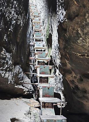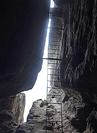 Das Beste am Aufstieg ist eine luftige, fast senkrechte, freistehende Eisenleiter (ca. 10 m lang) in der großen Klufthöhle.