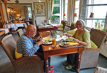 Im Bio-Restaurant "Strandgut" haben wir sehr gut gegessen — Blick über die Elbe zur Schrammsteinkette und den Postelwitzer Wänden.