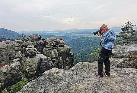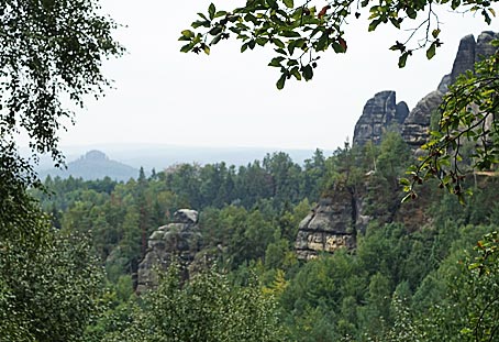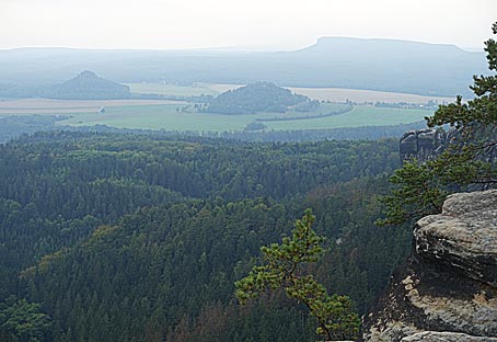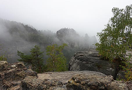Die Aussicht vom Plateau auf die Wald- und Felsenlandschaft des Elbsandsteingebirges ist einmalig - nur diesmal nicht. Der Nebel war zu dicht.