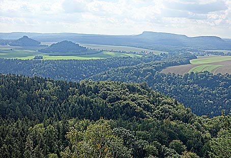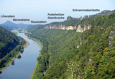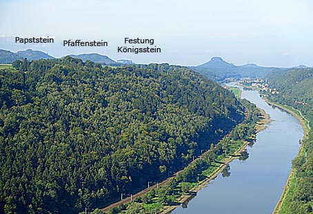 Auf den beiden Fotos sieht man das Elbtal und die gegenüber liegende Ebenheit mit Zirkelstein, Kaiserkrone und den beiden Zschirnsteinen.