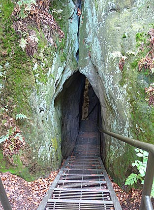 Auf steilen Eisentreppen führt der Abstieg in die dunkle Schlucht. |