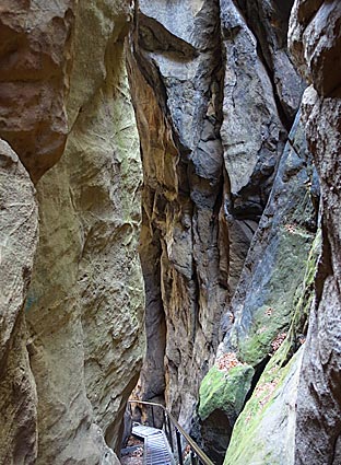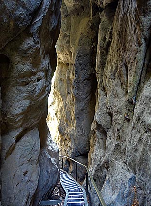 In der hohen, den Hockstein spaltenden Schlucht geht es über lange Reihen von Eisentreppen steil hinab.