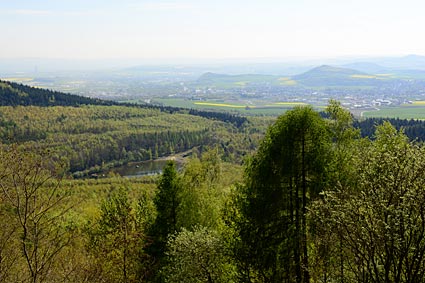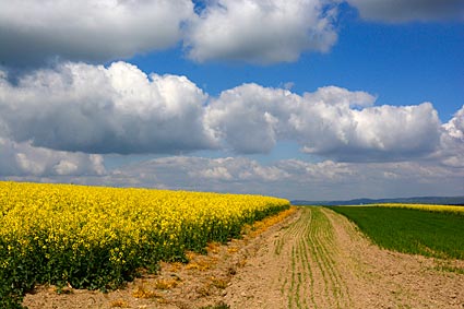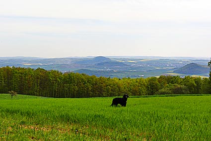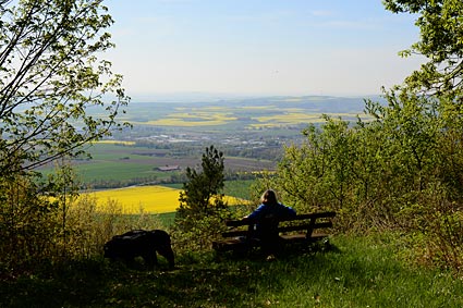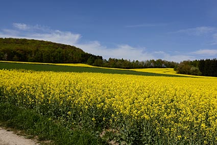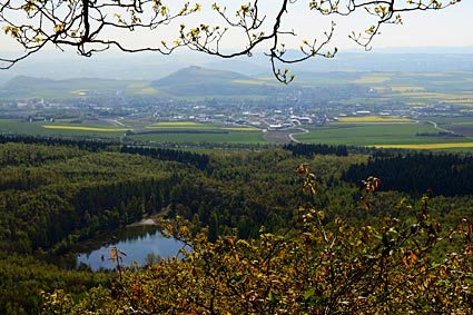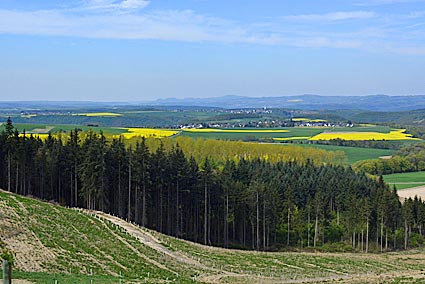 Aussicht vom Basaltschlacken-Vulkan Krufter Ofen - die Rapsfelder gaben der Landschaft ein leuchtend gelbes Muster