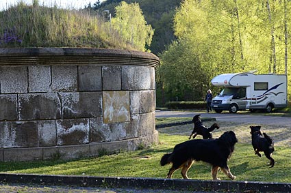Eigentlich wollten wir auf dem offiziellen Stellplatz von Nickenich übernachten. Der liegt aber im Tal ganz am anderen Ende von Nickenich, und da der Pellenzer Seepfad sowieso schon eine Länge von 16 km und 594 Höhenmeter hat, wollten wir zusätzlich nicht auch noch den weiten Weg durch die Ortschaft machen. Also fuhren wir gleich durch zum Parkplatz am römischen Tumulus. Hier konnten wir mit unserem Hundeopa auch einen kleinen Spaziergang in den angrenzenden Wald machen.