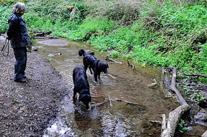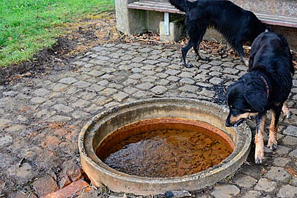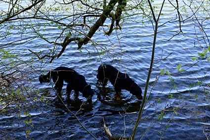 Die Hunde genießen die Erfrischung nach langer Wanderung.