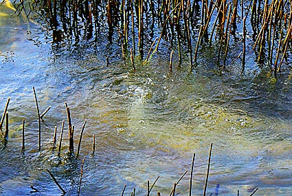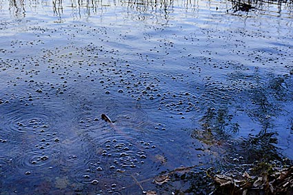 Auch heute noch ist der Laacher See ein ganz besonders interessantes Gewässer. Geht man an seiner Ostseite entlang, kann man das Blubbern der Mofetten sehen, ein Hinweis darauf, dass es dort unten, tief unter dem See immer noch arbeitet. Das hier aufsteigende Kohlendioxid-Gas stammt aus einer Magmakammer tief unter der Erdkruste und steigt unter dem See in Spalten herauf bis an die Erdoberfläche.