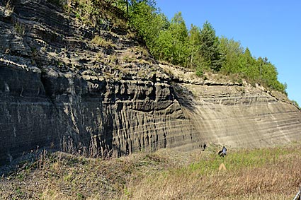 Im Größenvergleich mit dem kleinen Menschlein sieht man sehr gut, wie gigantisch auch diese Aschewand ist und bekommt eine vage Vorstellung, wie groß das Inferno vor 13.000 Jahren gewesen sein muss. Der Ausbruch des Laacher-See-Vulkans war 6-mal so stark wie der Ausbruch des Mount St. Helens 1980! Bedingt durch diese enorme Eruption kam es damals zu einer weltweiten klimatischen Veränderung.