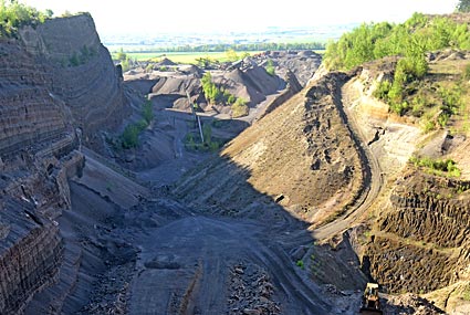 Was hier natürlich auch immer wieder zu sehen ist, sind Tagebaue. Rechts ein Blick in die Bimsgrube des Eppelsberg-Vulkans, der vor ca. 230.000 Jahren aktiv war. Die Tagebaue zeugen vom vulkanischen Ursprung dieser ganzen Region, der bis in die letzten Jahre, wenn auch stark nachlassend, vielen Menschen Lohn und Brot gab.