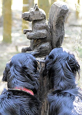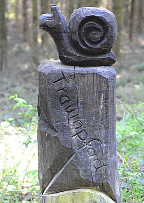 Bald wanderten wir durch einen Fichten-Hochwald, wo am Wegrand viele Holzfiguren standen. Die Hunde bestaunten das Eichhörnchen, das noch nicht mal weglaufen wollte ;-)) Mir hat die Traumpfad-Schnecke besonders gut gefallen. Der Holzschnitzer muss uns gekannt haben, denn wir brauchen für die Traumpfade immer viel länger, als in den Wegbeschreibungen angegeben wird.