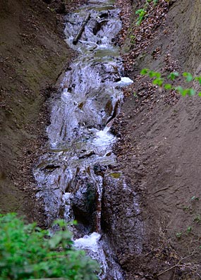 Auch im Römerbrunnen, an dem wir kurz danach vorbei kamen, blubberte es und roch auch etwas nach Schwefel. Diese natürlichen Mineralquellen enthalten Eisen, das bei Zutritt von Luft zu teilweise unlöslichen Eisenverbindungen oxidiert, deren dunkler, rötlich-brauner Niederschlag sich auf dem Boden sammelt (es "rostet").