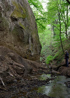 Allerdings starteten wir entgegen der empfohlenen Richtung. Die "Dramaturgie" dieses Weges sieht eigentlich vor, dass sich der Weg von Feld- und Wiesenpassagen über ein tief eingeschnittenes Bachtal und schönen Aussichten langsam zu den Trasshöhlen und der Wolfsschlucht steigert. Dieser Spannungsbogen ist normalerweise sehr sinnvoll. Doch da wir nicht wussten, wie das Wetter sich weiter entwickeln würde, haben wir uns für die entgegengesetzte Richtung entschieden. So lagen die Höhepunkte der Tour gleich am Anfang und wir hätten notfalls abbrechen können.