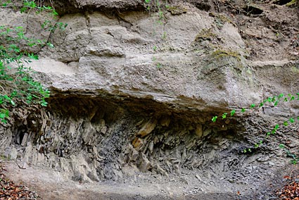 Der Trass ist ein sehr weiches Gestein, aus welchem sich schon mit den Fingern leicht Stücke lösen lassen. Gleichzeitig ist er so fest, dass in ihm mehrere eingegrabene, hohe Tunnel ohne weitere Stützung dauerhaft bestehen können. Dieser Trass stammt aus der Eruption des Laacher-See-Vulkans. Bei dieser Eruption wurde vulkanisches Ergussmaterial mehrere Kilometer hoch in die Atmosphäre geschleudert. Als die Intensität des Ausbruches nachließ brach diese Materialwolke zusammen. Durch die Eruptionen entstanden Gewitter mit extremen Regenfällen. In der gewaltigen Hitze verdampfte das Wasser aber sofort und verband sich mit den glutheißen Aschen zu einer tödlichen Schlamm- und Schuttlawine, die mit hoher Geschwindigkeit durch das Tal raste und sich später verfestigte.