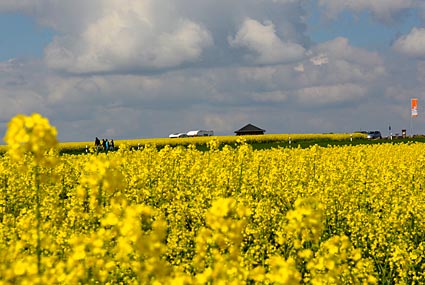 Auf der Hochebene angekommen, war die Traumpfad-Fahne schon von weitem zu sehen. Unser Wohnmobil lugte gerade so über die Rapsfelder und hatte sogar einen "Kollegen" bekommen. Obwohl der Parkplatz nicht gerade klein ist, war er inzwischen mit PKWs überfüllt, so dass die zu-spät-Gekommenen schon auf den angrenzenden Feldwegen parken mussten. Aber so ist das nun mal, wenn ein beliebter Wanderweg, ein Feiertag und gutes Wanderwetter aufeinander treffen.