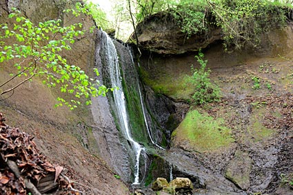 Über Kaskaden sprudelt das Wasser hinab und unterspült die Respekt einflößende Trasswand.