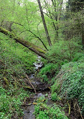 Nach dem steilen Aufstieg über den Herrmann-Löns-Weg und dem Schweppenburg-Blick ging es durch schöne Waldwege wieder hinab ins tief eingeschnittene Pönterbachtal. Dann hatten wir den interessantesten Teil des Traumpfades hinter uns. Bis auf einige wenige Tropfen waren wir trocken geblieben und inzwischen zeigte sich sogar die Sonne. Das schöne Wetter lockte offenbar viele Wanderer auf den Traumpfad. Je näher wir dem Krayerbachtal und dem Parkplatz kamen, desto mehr gut gelaunte Menschen begegneten uns. Die Idee, am Karfreitag diesen Traumpfad zu gehen, hatten also doch auch noch andere.