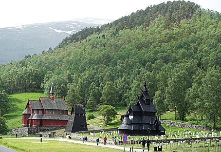 rechts: alte und neue Kirche von Borgund. In der Mitte zwischen den beiden Kirchen steht der Glockenturm.