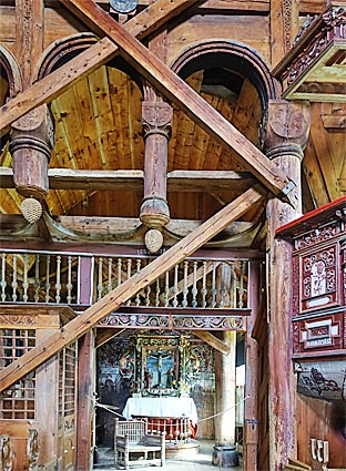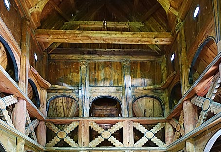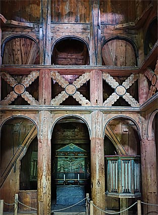 Typisch für Stabkirchen ist die Absteifung durch Zangen, Andreaskreuze |