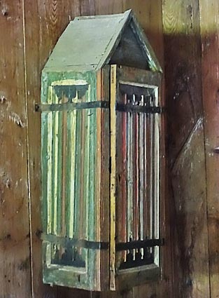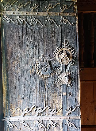 Die Eingangstür hat aufwendige schmiedeeiserne Beschläge. — Die Kanzel stammt aus dem Jahr 1695.