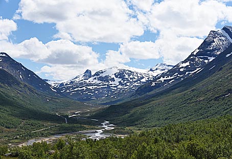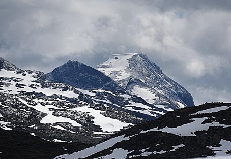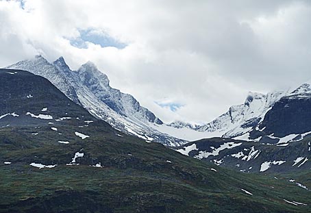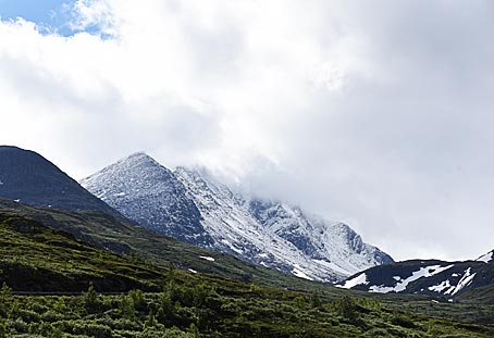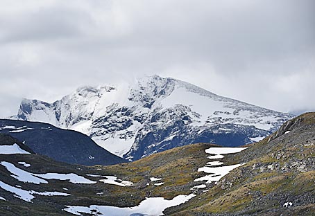 Die Rv55 führt durch eine wilde, nordische Berglandschaft mit den höchsten Bergen Skandinaviens.
